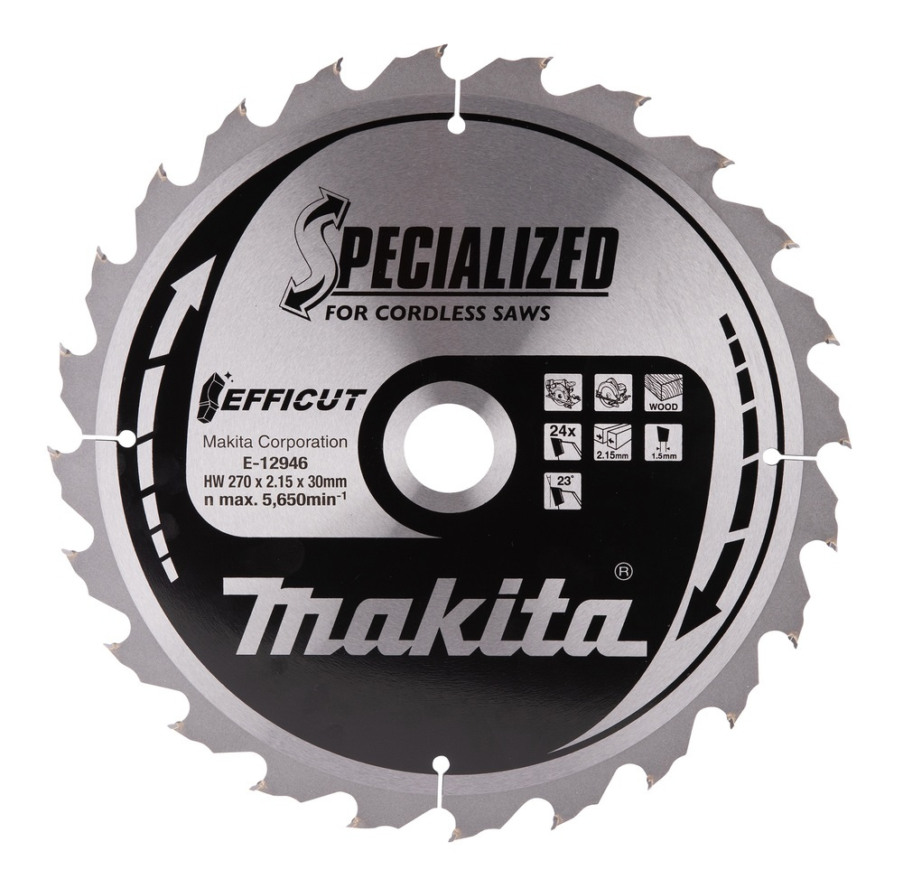 Tarcza tnąca do drewna 270 x 30 mm, 24Z Makita E-12946 to oryginalna tarcza z linii Makita Efficut typu T.C.T. do stosowania przy ręcznych przecinarkach tarczowych podczas cięcia drewna.