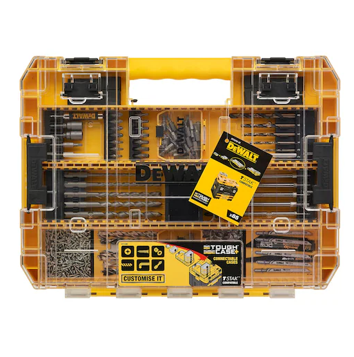 Zestaw końcówek i wierteł DeWALT DT70763 to kompletny zestaw akcesoriów, który sprawdzi się zarówno w profesjonalnych warsztatach, jak i podczas prac domowych. Zawiera wiertła do drewna, metalu oraz betonu, a także szeroki wybór końcówek wkrętarskich i nasadek. Wszystkie elementy umieszczone zostały w wytrzymałej kasecie Large Tough Case, będącej częścią systemu ToughCase+, co zapewnia wygodne i bezpieczne przechowywanie akcesoriów oraz możliwość rozbudowy o kolejne elementy. Transparentna pokrywa z poliwęglanu ułatwia szybkie odnalezienie potrzebnych narzędzi, a regulowane przegrody pozwalają na dostosowanie wnętrza do własnych potrzeb.
