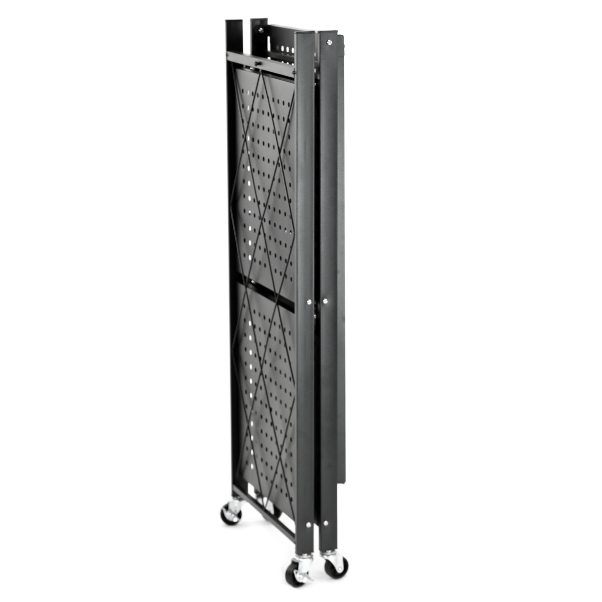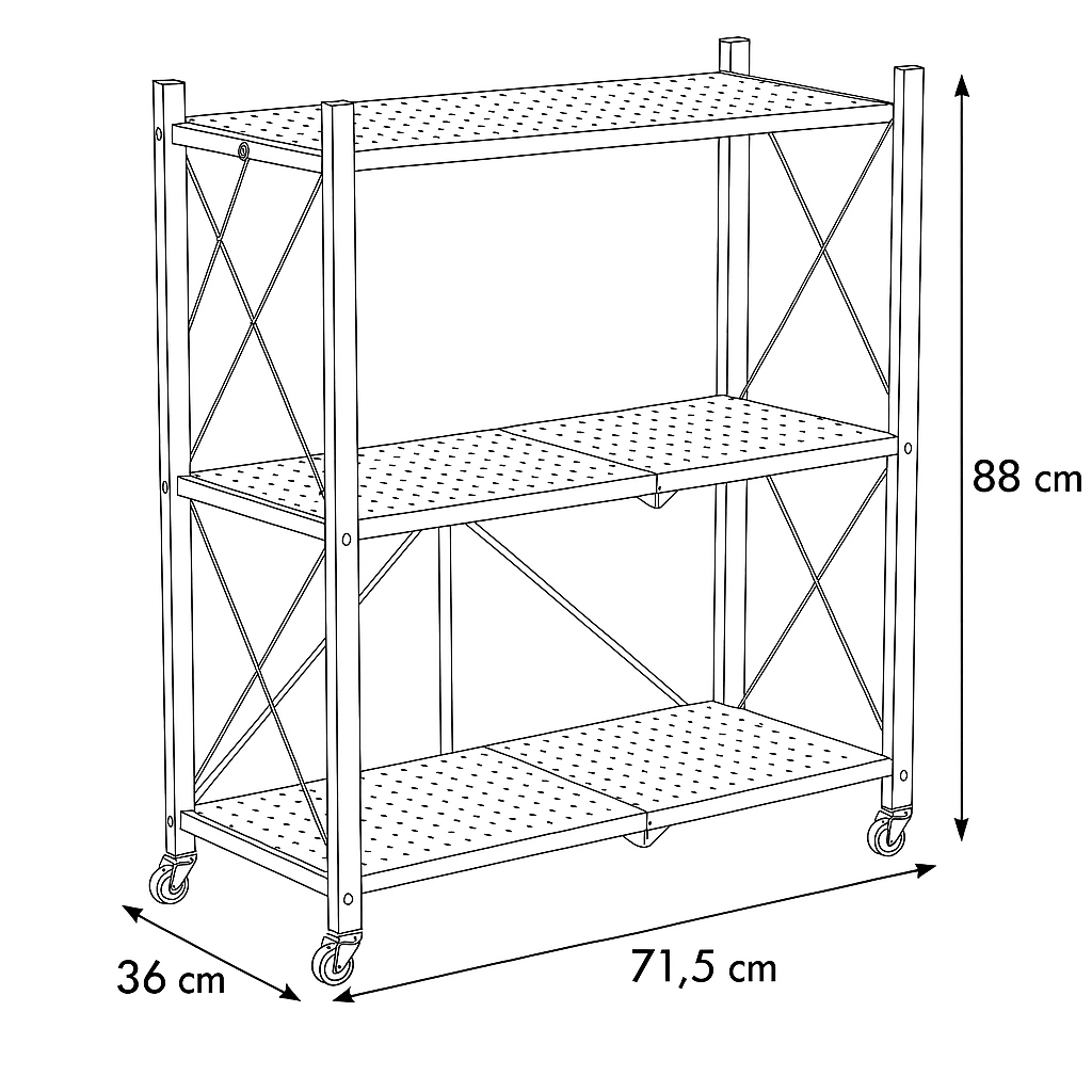 Jedną z największych zalet tego regału jest składana konstrukcja. Bez użycia narzędzi w kilka chwil rozłożysz go do pełnych wymiarów 36 × 71,5 × 88 cm, a gdy nie będzie potrzebny – złożysz do kompaktowych rozmiarów 8,5 × 36 × 88 cm.