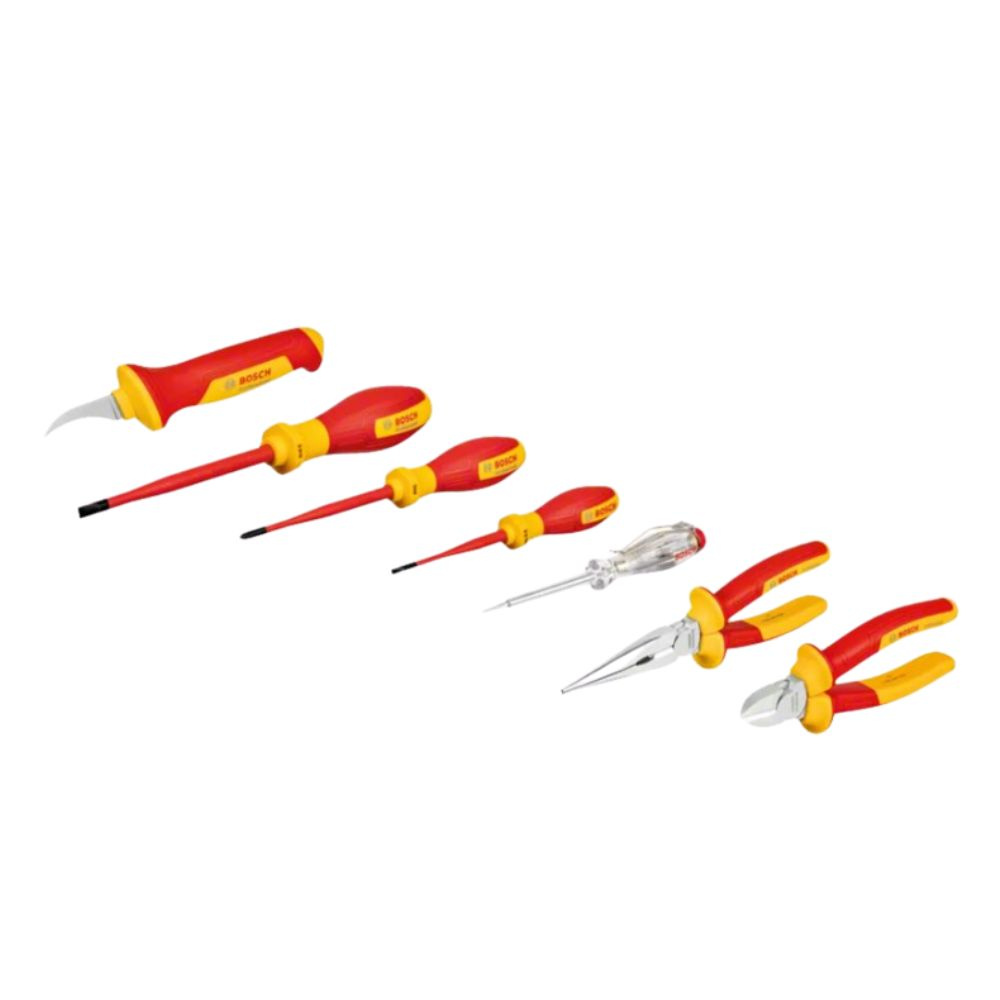 Zestaw narzędzi ręcznych Bosch 1600A02NG3 został zaprojektowany z myślą o bezpiecznej pracy przy instalacjach elektrycznych. W jego skład wchodzą 2 pary szczypiec VDE, 3 wkrętaki VDE, nóż do zdejmowania izolacji oraz jednobiegunowy próbnik fazowy, co czyni go uniwersalnym kompletem dla elektryków i majsterkowiczów.