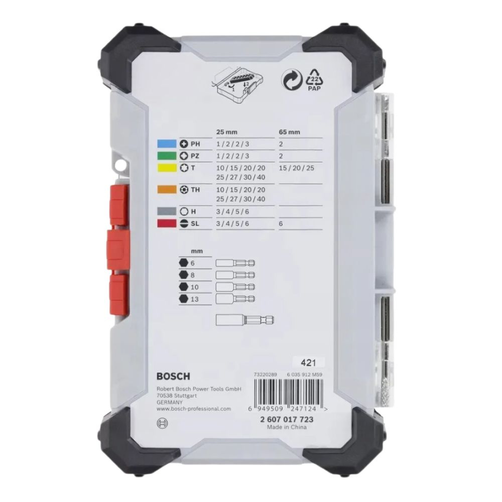 Zestaw Bosch 2607017723 to 43-częściowy komplet typu Extra Hard Set, stworzony z myślą o wszechstronnym zastosowaniu przy wkręcaniu i montażu. System Pick and Click umożliwia szybki dobór odpowiedniego bitu lub nasadki, co znacząco zwiększa wydajność pracy.