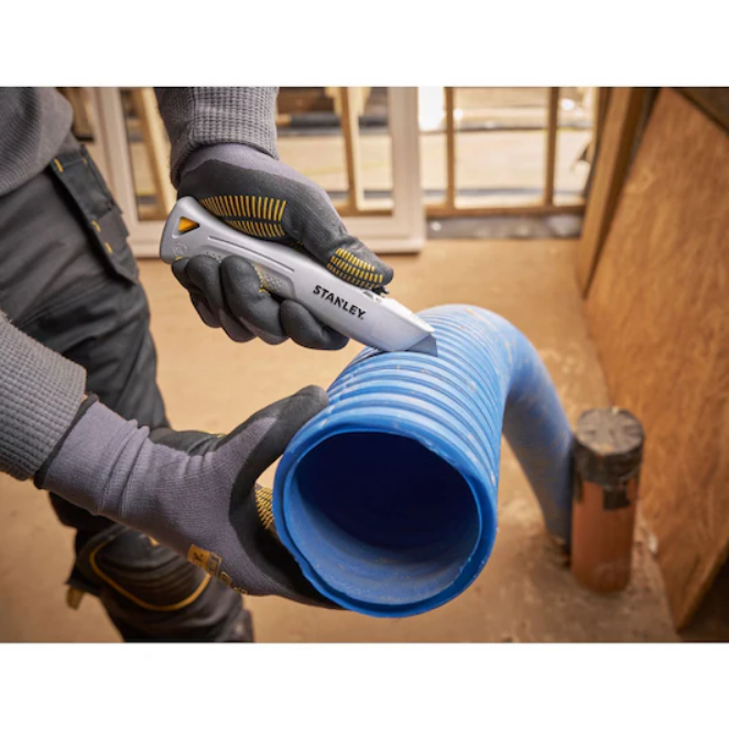 Nóż trapezowy Stanley Fatmax FMHT10505-0 to solidne narzędzie zaprojektowane do wymagających zadań cięcia. Sprawdzi się w pracy z materiałami takimi jak wykładziny, panele podłogowe, płyty gipsowe czy karton. Wytrzymała konstrukcja zapewnia trwałość i bezpieczeństwo podczas użytkowania, a mechanizm chowanego ostrza umożliwia wygodne i bezpieczne przechowywanie. Model ten wyposażono w funkcję szybkiej wymiany ostrza bez użycia dodatkowych narzędzi – system zintegrowany z suwakiem pozwala na sprawną i bezproblemową wymianę, co minimalizuje przestoje podczas pracy.