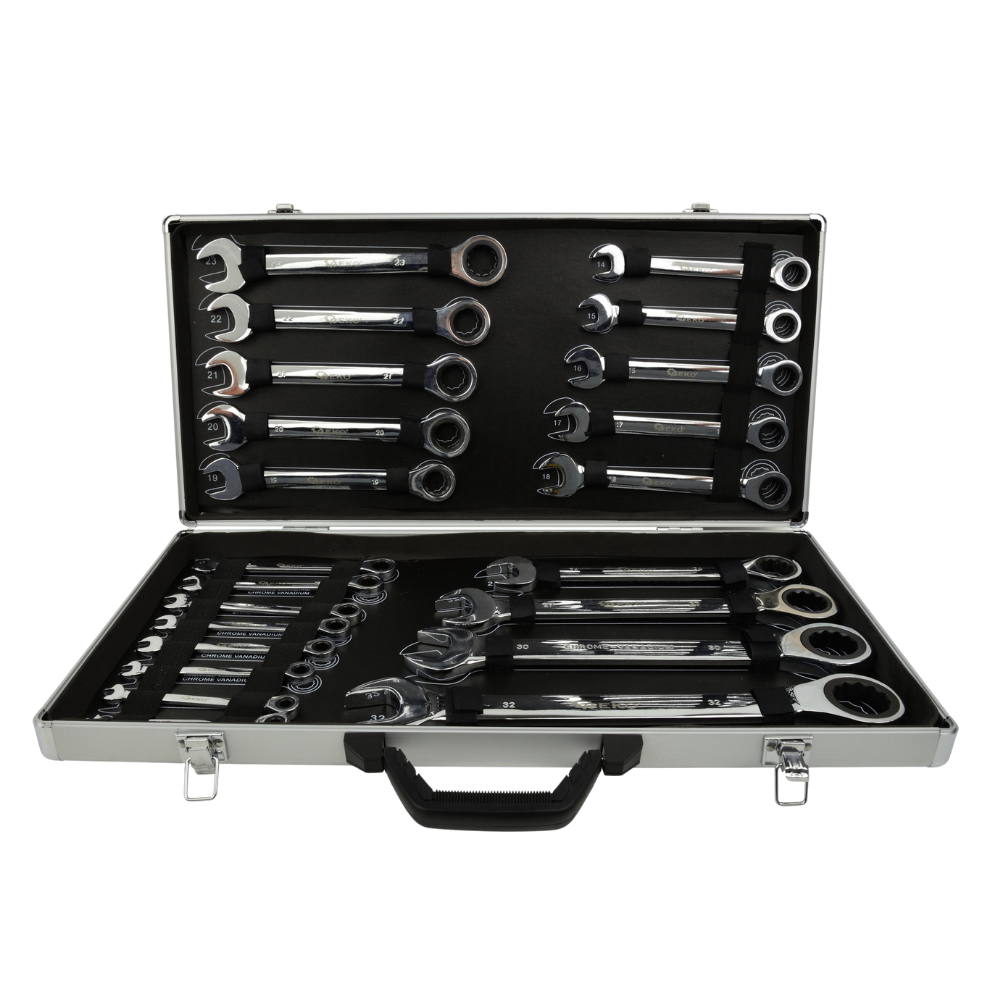 Komplet kluczy płasko-oczkowych z grzechotką G10341 to solidny zestaw 22 elementów o rozmiarach od 6 do 32 mm, idealny do wszechstronnych prac warsztatowych i serwisowych. Każdy klucz został wyposażony w mocny mechanizm zapadkowy z 72 zębami wykonanymi z hartowanej stali, co gwarantuje płynną pracę, precyzję oraz wysoką trwałość nawet przy intensywnym użytkowaniu.