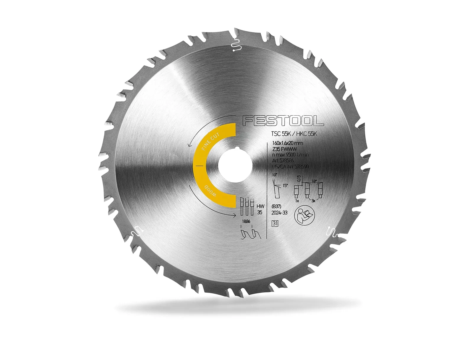 Tarcza do cięcia drewna Festool HW 160x1,6x20 FWWW35 578586 z serii WOOD FINE CUT to cienkotnąca tarcza o szerokości rzazu 1,6 mm, opracowana pod pilarki akumulatorowe HKC 55 K i TSC 55 K. Zęby z drobnoziarnistego węglika spiekanego oraz geometria do cięć precyzyjnych zapewniają gładkie krawędzie bez wyrwań w drewnie litym, płytach fornirowanych/powlekanych i MDF. Cienki rzaz zmniejsza opór, co przekłada się na szybszą pracę i oszczędność energii akumulatora.
