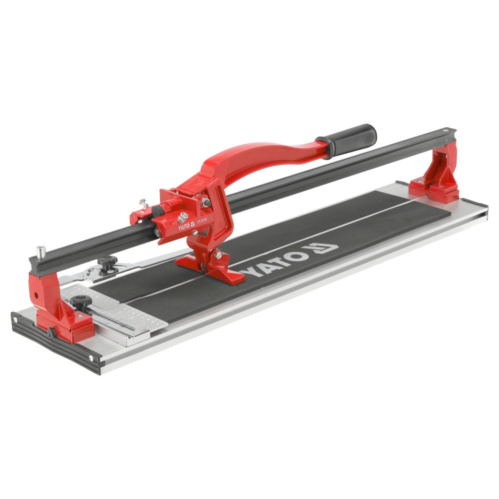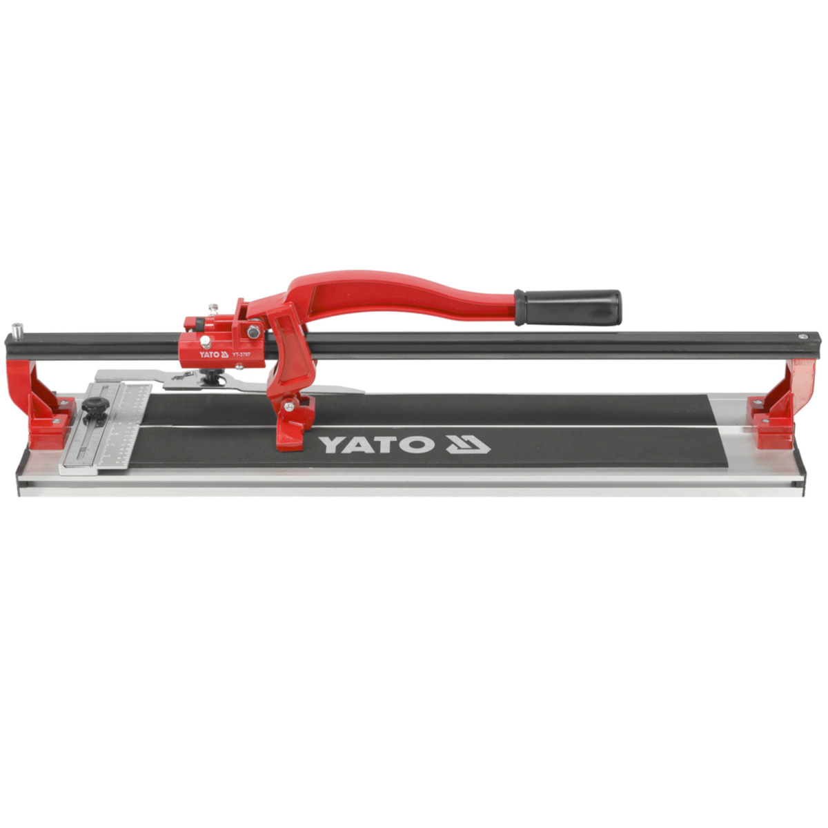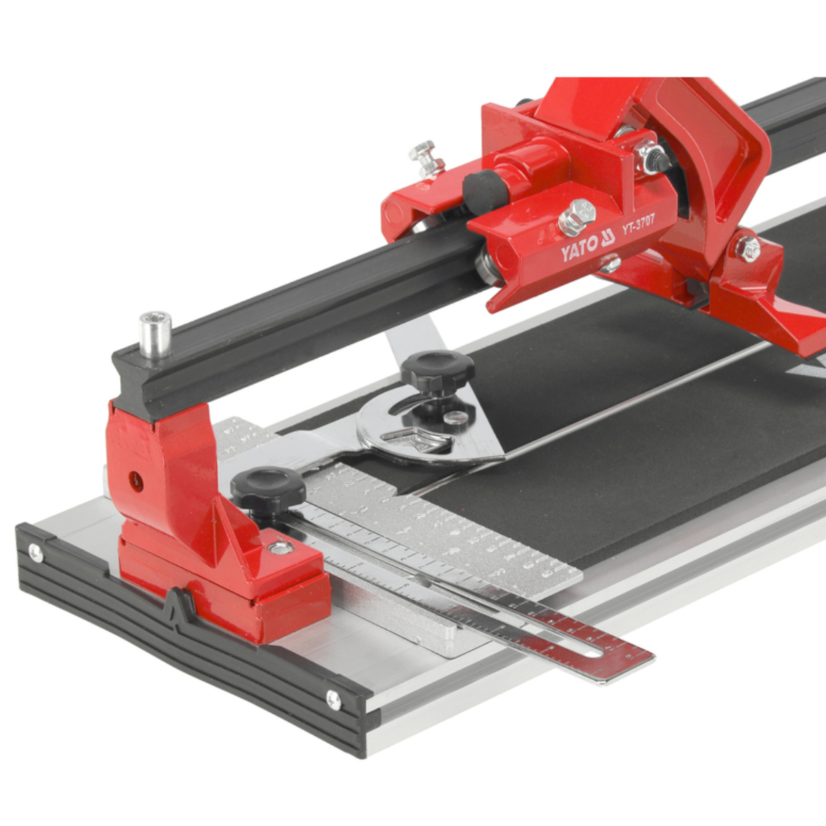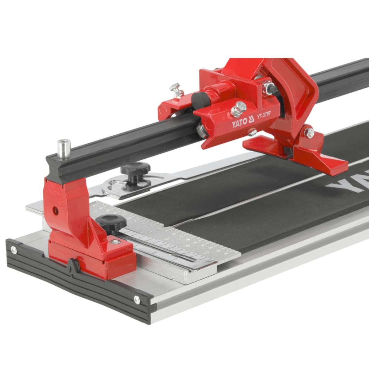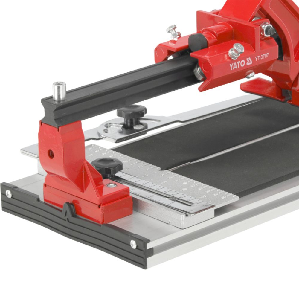 Przecinarka do glazury Yato YT-3707 to solidne narzędzie ręczne przeznaczone do cięcia płytek ceramicznych. Maksymalna długość cięcia wynosi 600 mm, a grubość ciętej płytki może sięgać 16 mm, co pozwala na obróbkę zarówno mniejszych, jak i większych formatów. Blat urządzenia został pokryty miękką pianką, która ułatwia precyzyjne łamanie płytek i zapobiega ich uszkodzeniu. Pojedyncza, profilowana prowadnica gwarantuje stabilność i dokładność cięcia, a wbudowana podziałka pozwala na łatwe odmierzanie szerokości.