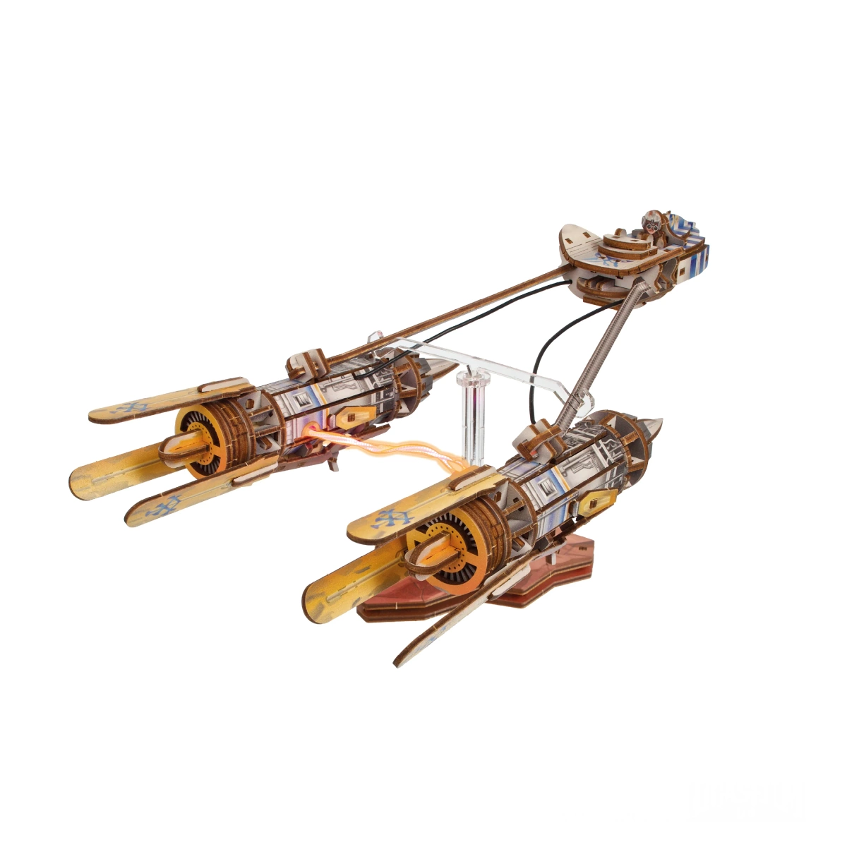 Ścigacz Anakina StarWars™ UGEARS 70273 to wyjątkowy, drewniany model 3D inspirowany filmem Gwiezdne Wojny: Mroczne Widmo. Zestaw pozwala własnoręcznie zbudować kultowy pojazd Anakina Skywalkera – ścigacz, dzięki któremu młody bohater zwyciężył w wyścigu Boonta Eve Classic na Tatooine. Model łączy precyzyjne detale z elementami elektronicznymi: ruchomym systemem równoważenia, efektami świetlnymi LED oraz otwieraną kabiną pilota. Został wykonany z barwionej sklejki wysokiej jakości i nie wymaga kleju ani specjalnych narzędzi do montażu. To efektowna propozycja zarówno dla fanów Star Wars™, jak i miłośników mechanicznych puzzli UGEARS.