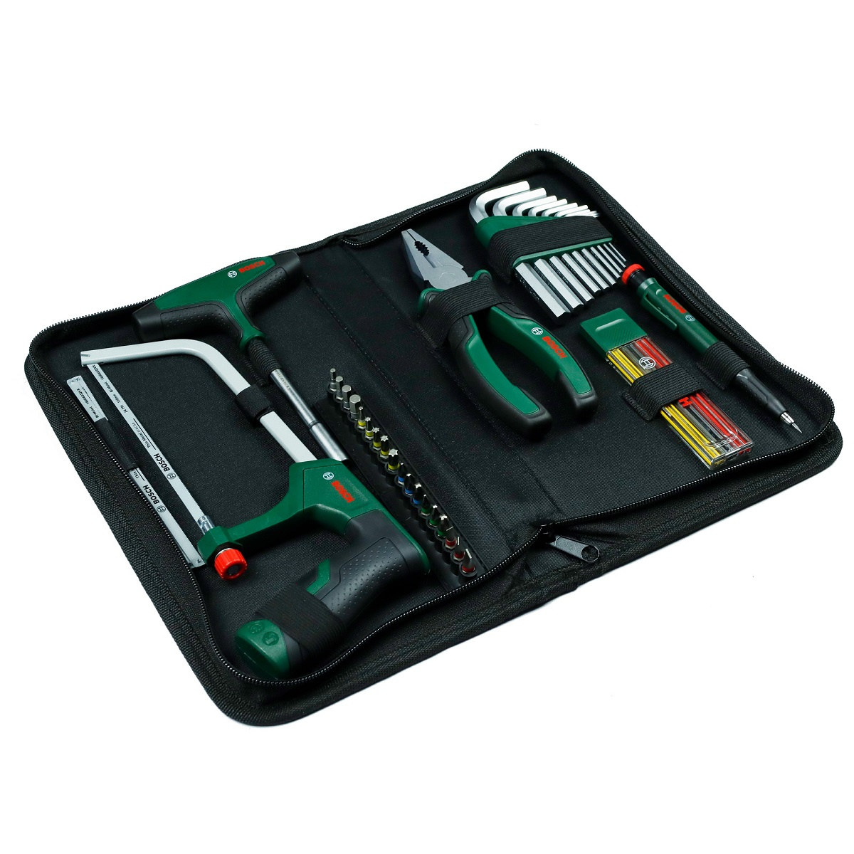 Wśród narzędzi znajdują się m.in. piłka do metalu 150 mm, kombinerki 180 mm, wkrętak z rękojeścią typu T, znacznik do głębokich otworów, 10-częściowy zestaw kluczy sześciokątnych oraz 18 kolorowych końcówek wkręcających, a także dodatkowe brzeszczoty do piłki i wkłady w różnych kolorach. Dzięki różnorodności elementów zestaw ten umożliwia wykonanie szerokiej gamy prac – od drobnych napraw, przez skręcanie mebli, po precyzyjne cięcia i montaż.