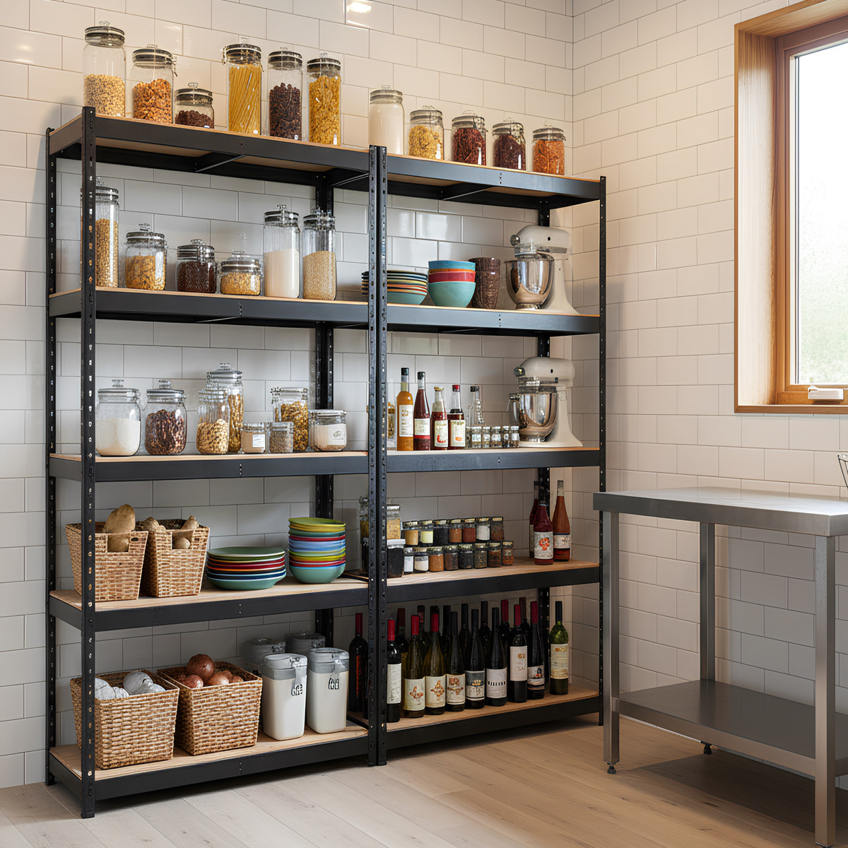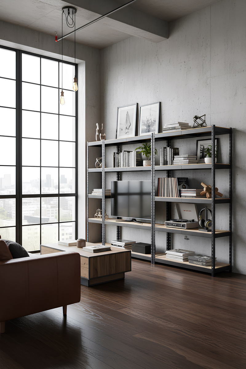 Regulowana wysokość półek umożliwia dopasowanie przestrzeni do różnej wielkości przedmiotów – od narzędzi i skrzynek po kartony czy segregatory.