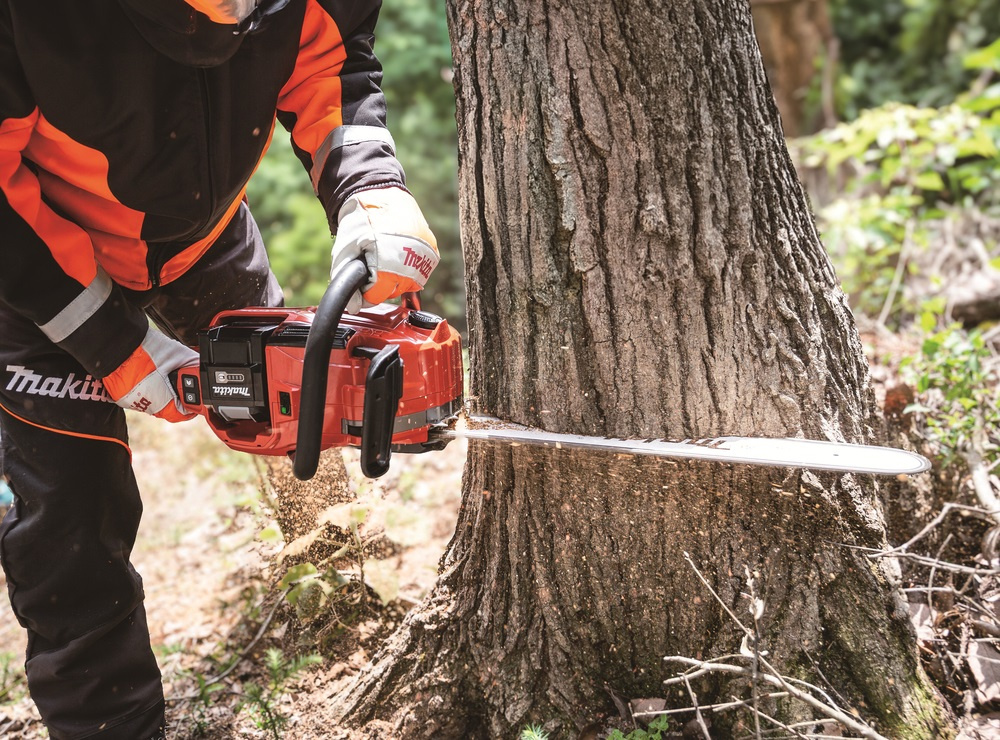 Pilarka łańcuchowa Makita UC030GZ03 to zaawansowane narzędzie akumulatorowe stworzone z myślą o intensywnym cięciu drewna. Wyposażona w bezszczotkowy silnik BLDC oferuje osiągi zbliżone do pilarek spalinowych z silnikiem o pojemności 50 cm³ (przy zastosowaniu akumulatora BL4080H). Urządzenie dostępne jest w dwóch wersjach kolorystycznych: klasycznym niebieskim Makita oraz pomarańczowym, co ułatwia dopasowanie do preferencji użytkownika.