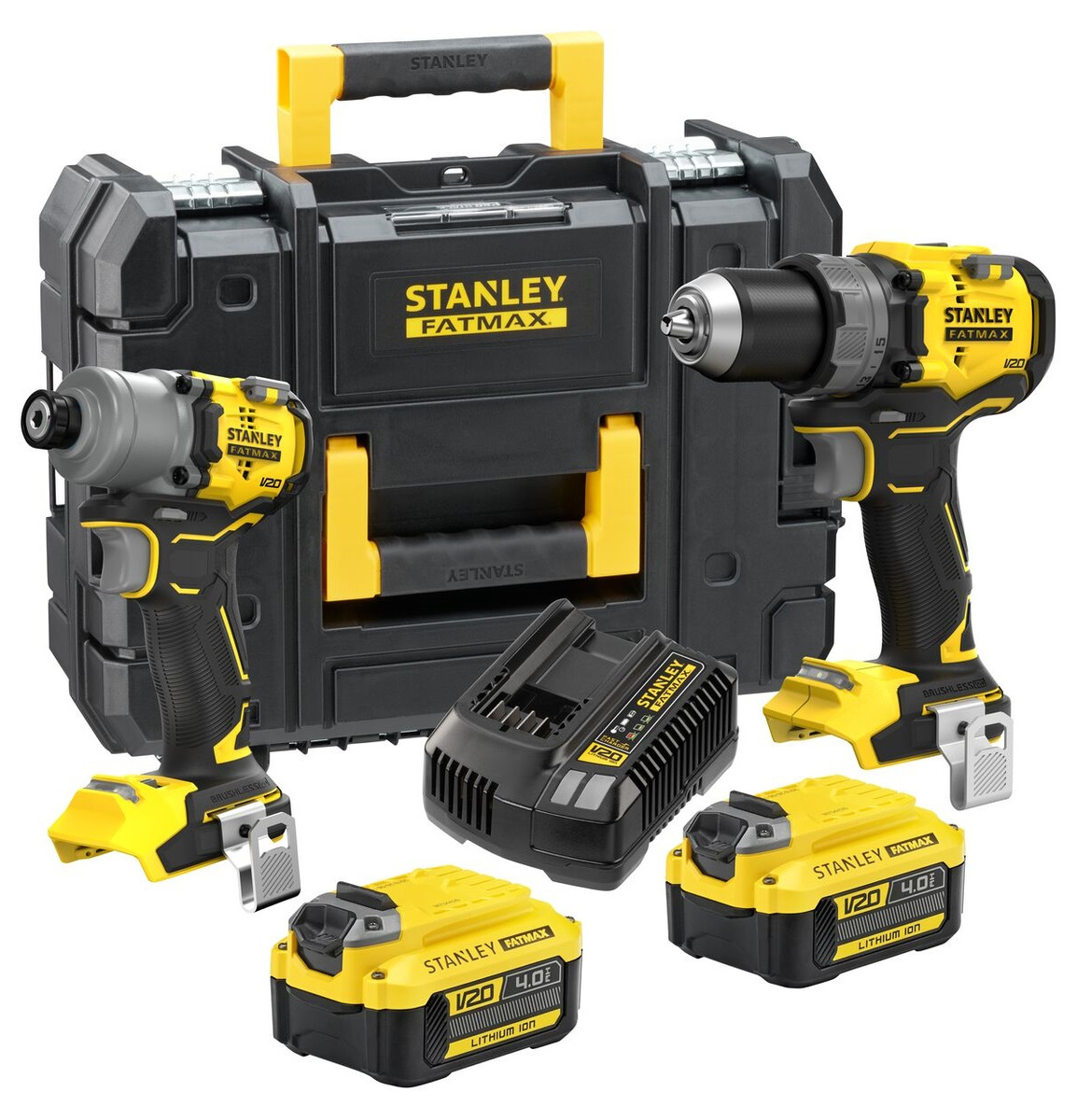 Zestaw elektronarzędzi Stanley Fatmax SFMCK211M2T-QW to komplet dwóch bezprzewodowych narzędzi akumulatorowych z silnikami bezszczotkowymi, zawierający wiertarko-wkrętarkę udarową SFMCD726 oraz zakrętarkę udarową SFMCF830 - dostarczane z dwoma pojemnymi akumulatorami (każdy o pojemności 4,0 Ah), ładowarką i walizką transportową Pro-Stack.