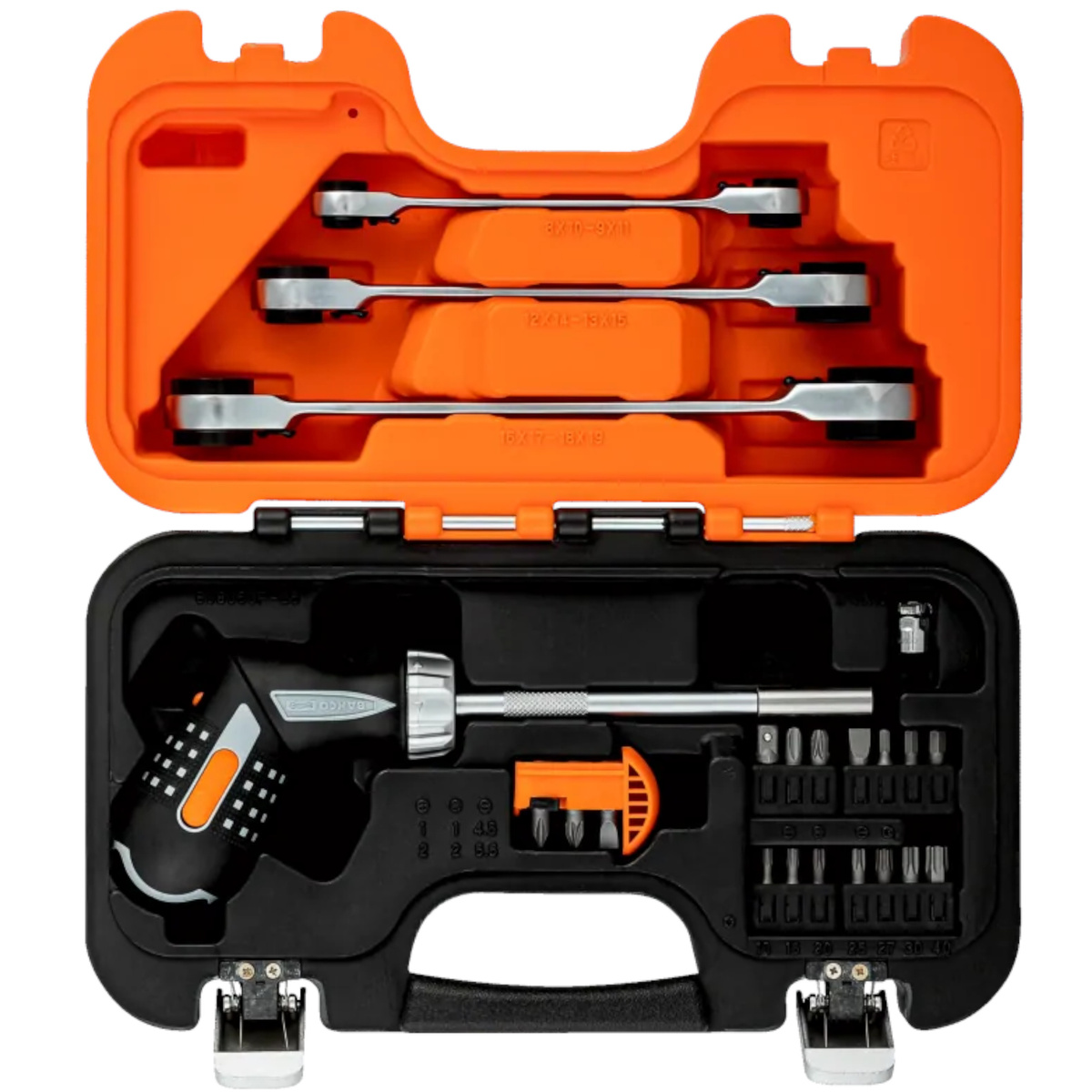 Głównym elementem zestawu jest ergonomiczny wkrętak grzechotkowy o konstrukcji pistoletowej, ułatwiający pracę w trudno dostępnych miejscach. Dołączono do niego zestaw 6 podstawowych bitów do śrub prostych, Philips i Pozidriv oraz adaptery umożliwiające korzystanie z nasadek i bitów 1/4". Całość uzupełniają trzy dwustronne klucze grzechotkowe o najczęściej używanych rozmiarach – od 8 do 19 mm – które zapewniają szybki i wygodny montaż i demontaż połączeń śrubowych.