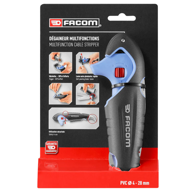 Wielofunkcyjne narzędzie do ściągania izolacji Facom 872271PB to kompaktowe i precyzyjne rozwiązanie dla profesjonalistów zajmujących się instalacjami elektrycznymi. Dzięki systemowi ze spustem, który zmniejsza wysiłek użytkownika nawet o 30%, oraz samoobracającemu się ostrzu, proces zdejmowania izolacji staje się szybszy i bardziej intuicyjny. Dodatkowe zabezpieczenia chronią użytkownika przed przypadkowym uruchomieniem narzędzia, a uniwersalny zakres pracy pozwala na obróbkę kabli o średnicy od 4 do 28 mm. Niewielka waga sprawia, że narzędzie jest wygodne w codziennym użytkowaniu.