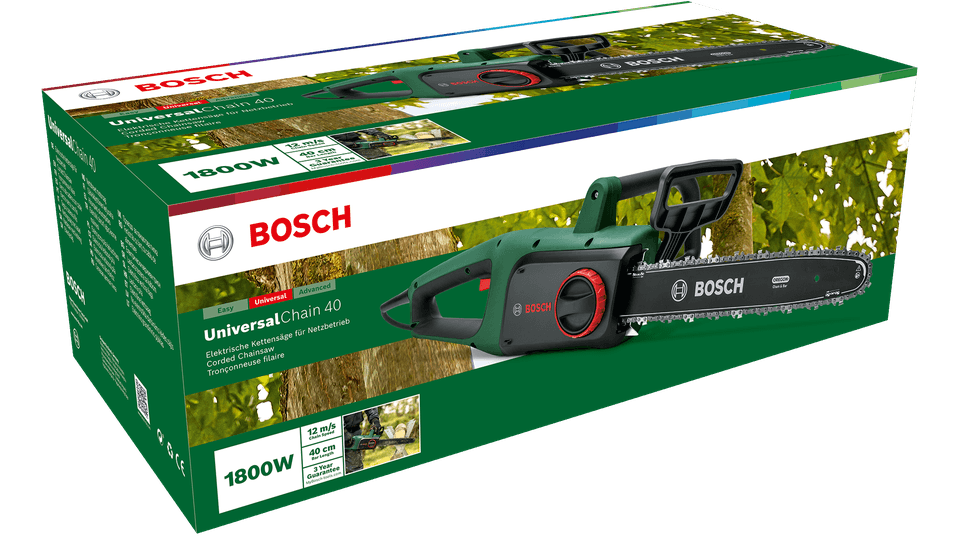 Piła łańcuchowa Bosch Universal Chain 40 (06008B8402) to sieciowe narzędzie przeznaczone do wydajnego cięcia gałęzi, drewna opałowego i pniaków. Dzięki silnikowi o mocy 1 800 W oraz prędkości przesuwu łańcucha 12 m/s, urządzenie umożliwia szybkie tempo pracy i gładkie cięcia. Lekka konstrukcja (4,2 kg) i ergonomiczny uchwyt sprawiają, że obsługa jest komfortowa nawet podczas dłuższych zadań.