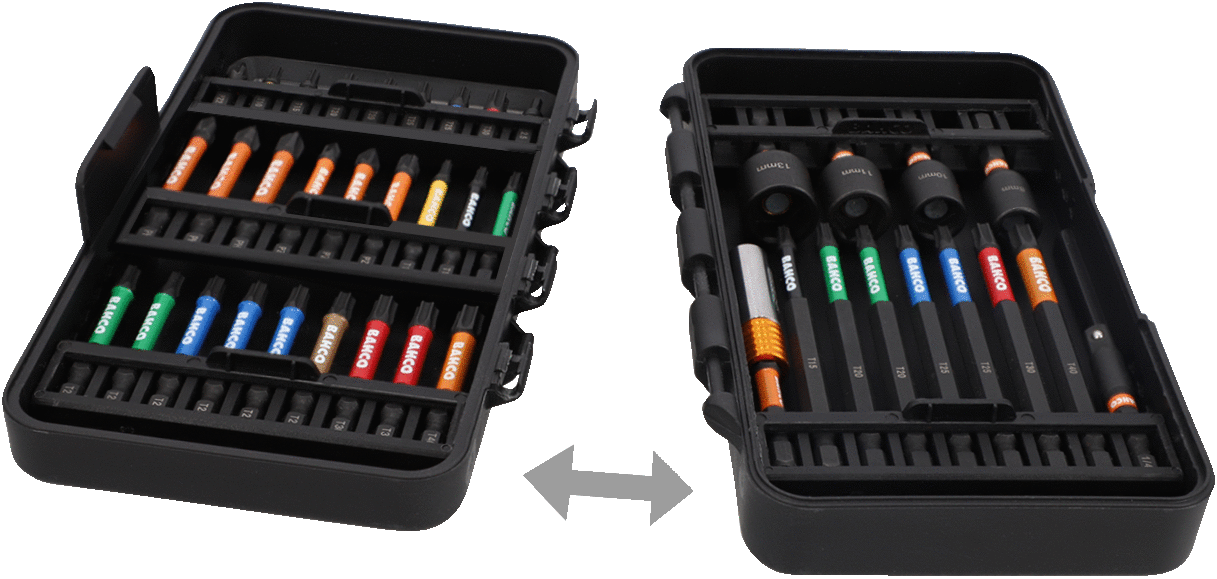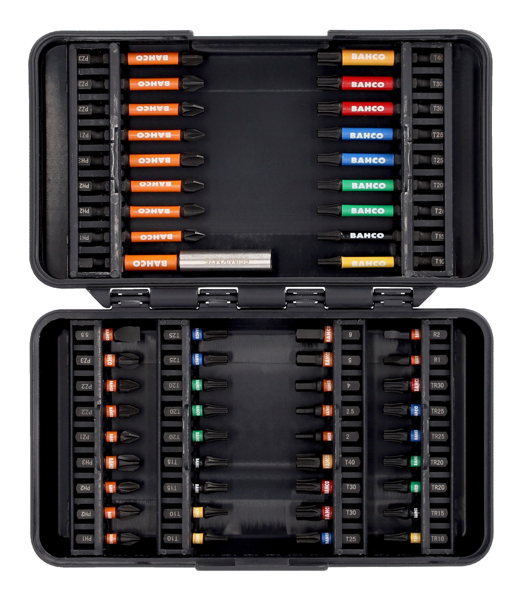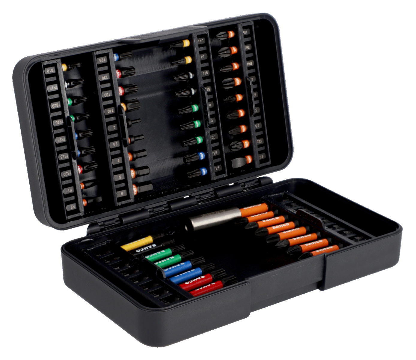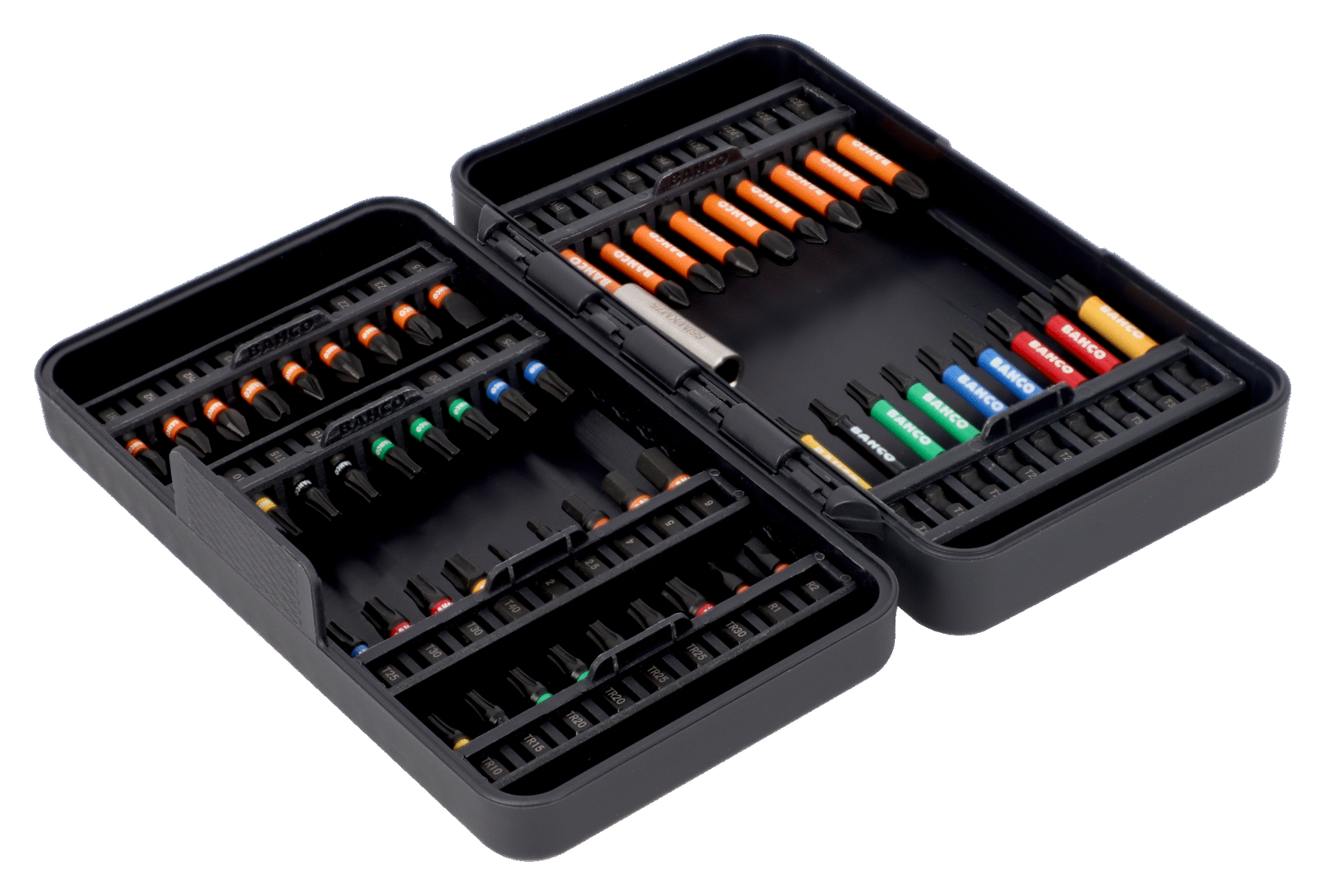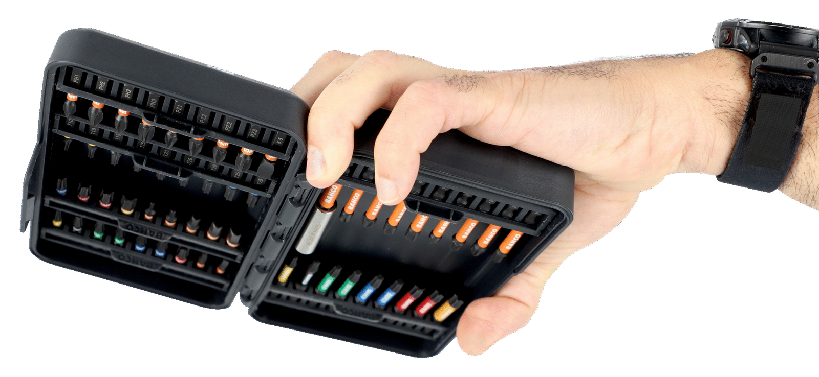 Zestaw pokrywa szeroki zakres typów śrub – od Phillips, Pozidriv, płaskich i sześciokątnych po TORX®, TORX® Tamper i Robertson – co czyni go uniwersalnym rozwiązaniem dla wielu branż. Całość umieszczono w wytrzymałej, odpornej na uderzenia obudowie z blokadą 180°, którą można ustawić w pozycji otwartej. Obudowę zaprojektowano z myślą o organizacji i mobilności – daje możliwość sztaplowania oraz rozdzielania pokrywy i korpusu. W zestawie znajduje się także naklejka do personalizacji.