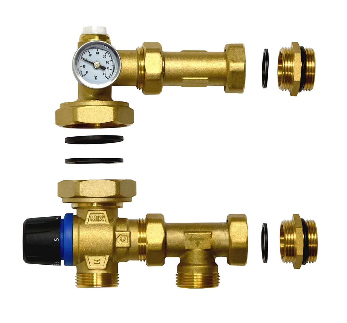 Zestaw zawiera wszystkie niezbędne komponenty do prawidłowego funkcjonowania systemu z zaworem mieszającym, termometrem oraz przyłączami. Grupa nie zawiera pompy – należy ją dobrać oddzielnie spośród rekomendowanych modeli zgodnych z wymaganiami instalacji.