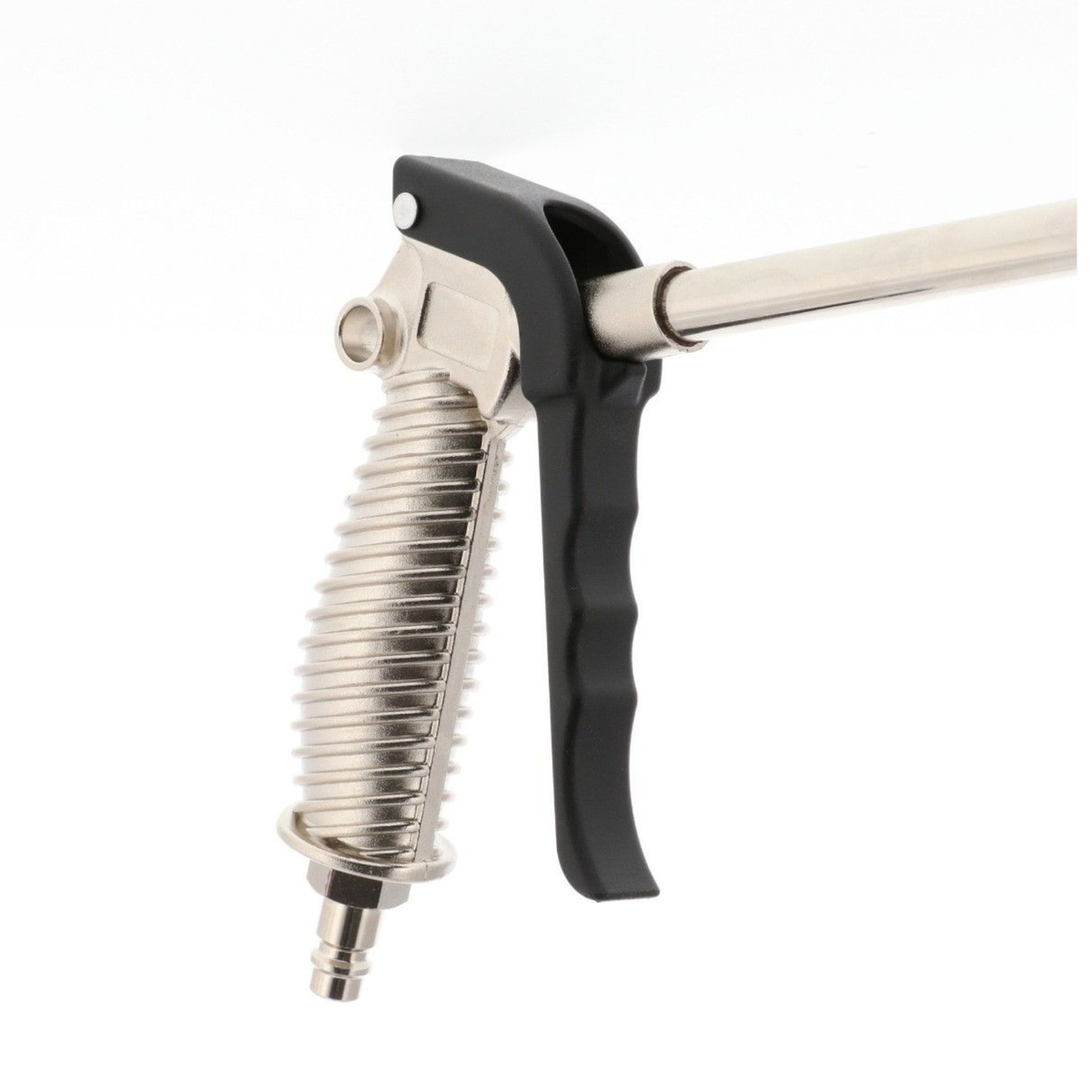 Pistolet do przedmuchu Airpress 45027 to specjalistyczne narzędzie pneumatyczne przeznaczone do usuwania zanieczyszczeń z trudno dostępnych miejsc w maszynach, instalacjach przemysłowych i warsztatach. Wyposażony w długą, 95-centymetrową dyszę oraz solidną aluminiową obudowę, pistolet łączy wytrzymałość z wygodą użytkowania. Ergonomiczny uchwyt ułatwia precyzyjne prowadzenie strumienia powietrza, a wysokie maksymalne zużycie powietrza do 945 l/min pozwala na efektywną pracę w najbardziej wymagających warunkach. W zestawie znajdują się dodatkowe dysze, które zwiększają uniwersalność narzędzia.