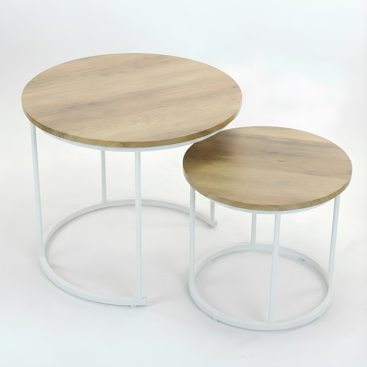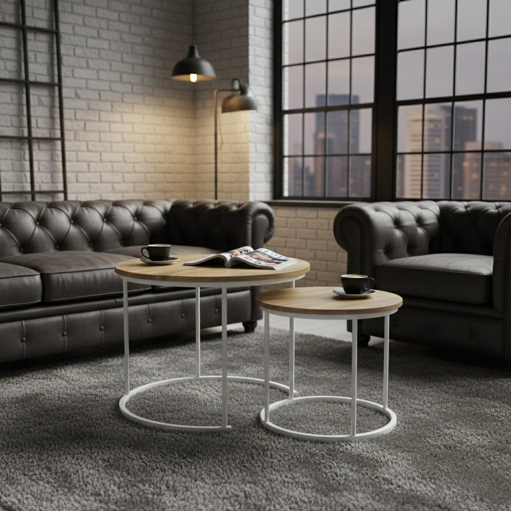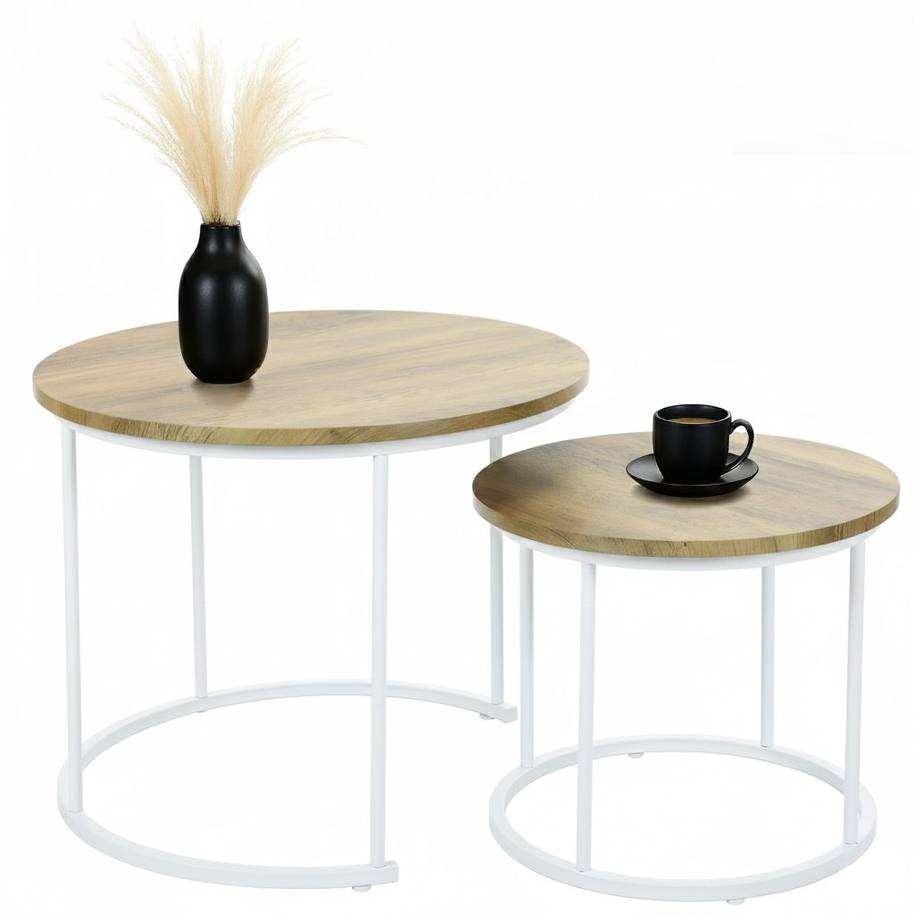 Zestaw stolików kawowych Belivio ALBA ROYAL OAK to duet, który łączy lekkość loftowego stylu z codzienną wygodą. Dwa okrągłe stoliki w naturalnym odcieniu dębu, wsparte na białym, stalowym stelażu, wprowadzają do wnętrza świeżość, harmonię i odrobinę industrialnego charakteru.