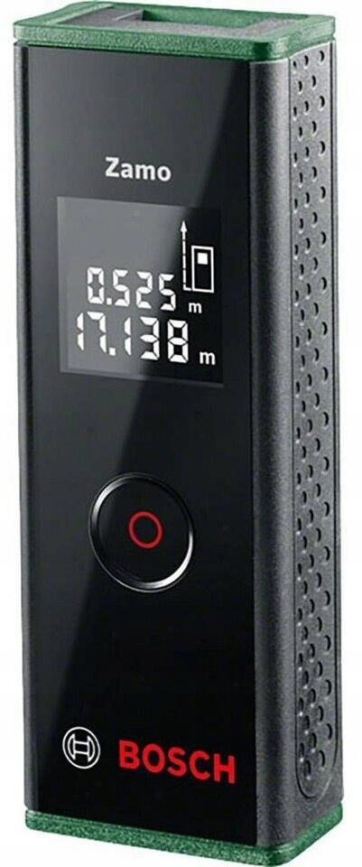 Laserowy dalmierz Bosch Zamo III Set to kompaktowe i intuicyjne w obsłudze narzędzie pomiarowe, które umożliwia szybkie i dokładne pomiary do 20 metrów. Dzięki prostej obsłudze za pomocą jednego przycisku, użytkownik może zmierzyć długość, powierzchnię, a nawet objętość pomieszczenia w zaledwie kilka chwil. Urządzenie oferuje funkcje dodawania, odejmowania, mnożenia oraz obliczania powierzchni i objętości, co czyni je niezwykle wszechstronnym rozwiązaniem do codziennych zadań domowych lub majsterkowania. Bosch Zamo III wyposażony jest w czytelny wyświetlacz LCD, funkcje zapisu wartości (Hold) oraz wskazania wartości minimalnej i maksymalnej (Min/Max), a automatyczne wyłączanie i wskaźnik poziomu baterii zwiększają wygodę użytkowania. W zestawie znajdują się również dwa adaptery, które pozwalają rozszerzyć możliwości pomiarowe urządzenia.