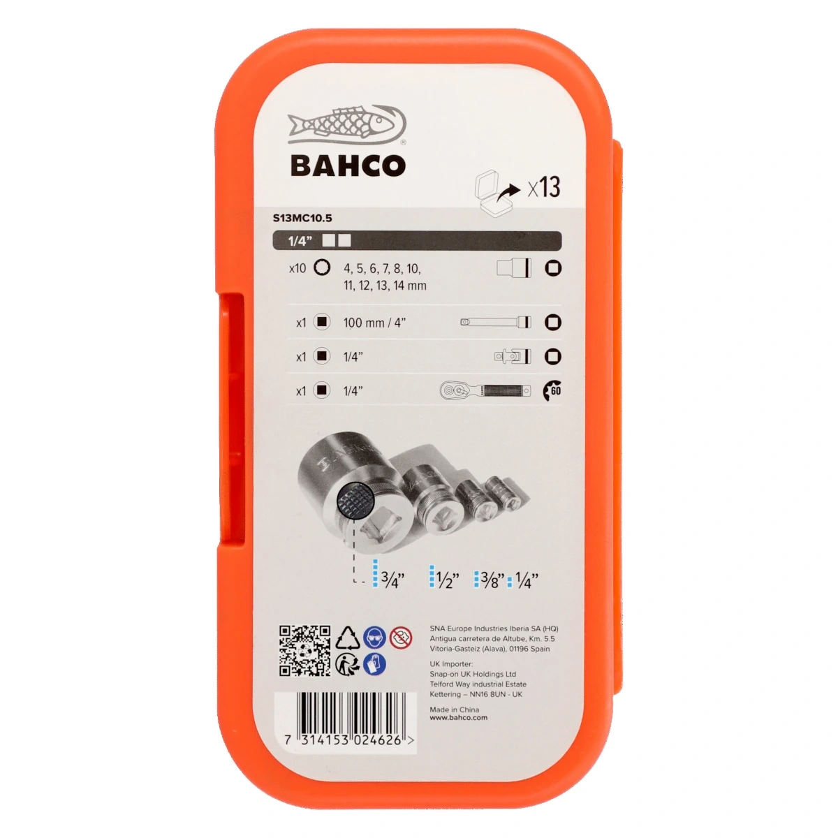 Zestaw kluczy nasadowych 1/4" Bahco S13MC10.5 to kompaktowe i funkcjonalne rozwiązanie dla profesjonalistów i majsterkowiczów. W skład zestawu wchodzą 12-kątne nasadki ręczne w najczęściej używanych rozmiarach metrycznych, wykonane ze stali stopowej zgodnie z normami ISO i DIN. Nasadki z serii 6700DM cechuje profil Dynamic Drive, który zapewnia lepsze rozłożenie sił i większy moment obrotowy, chroniąc śruby przed uszkodzeniem oraz umożliwiając pracę nawet z lekko zniszczonymi łbami. Radełkowanie w części chwytnej pozwala na pewniejsze dokręcanie ręką nawet w rękawicach lub przy mokrych dłoniach.