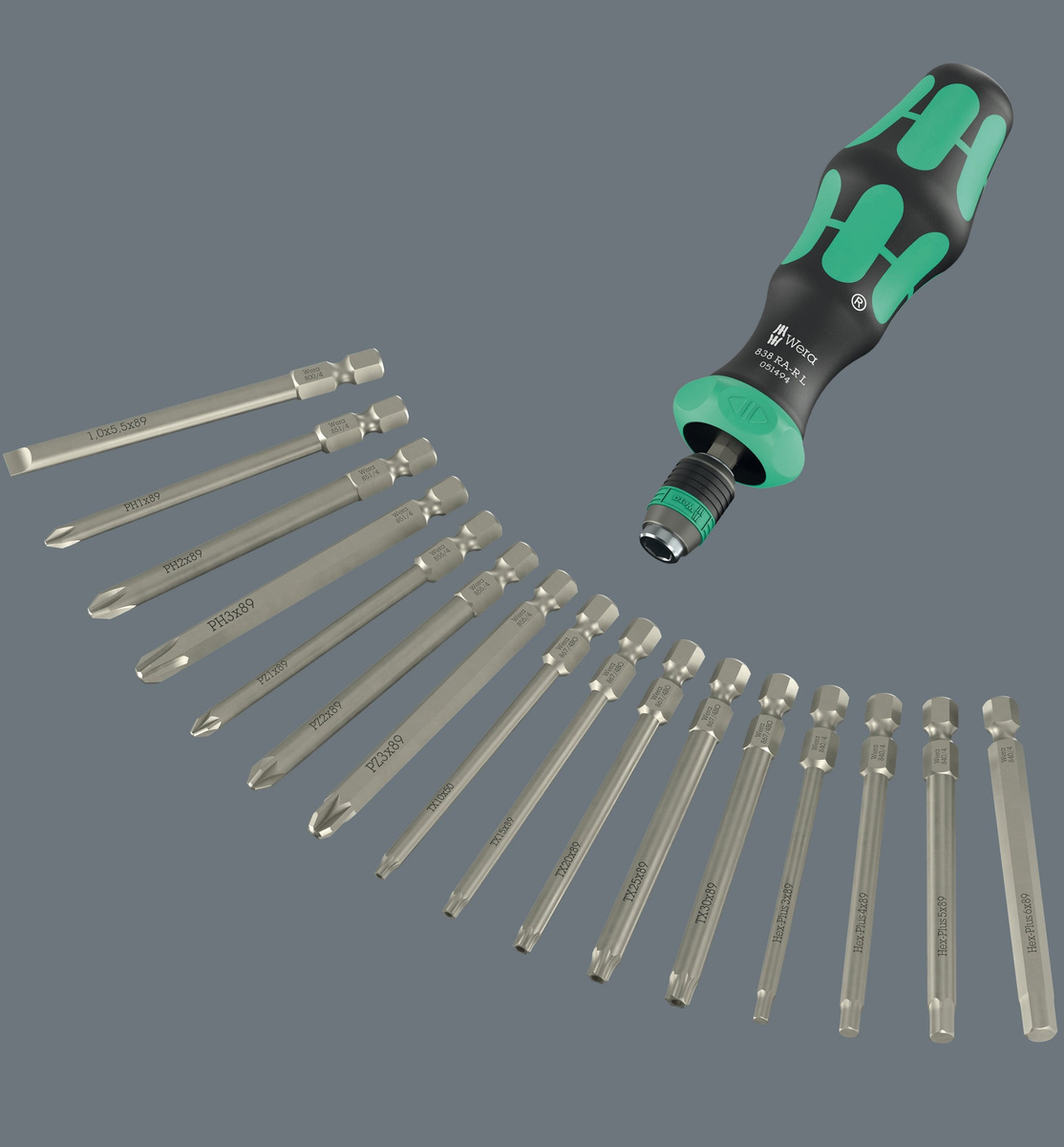 - 1x rękojeść z uchwytem do bitów 838 RA-R L – 1/4" x 140 mm (05051494001)