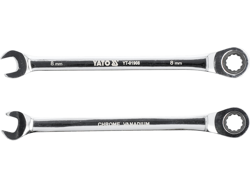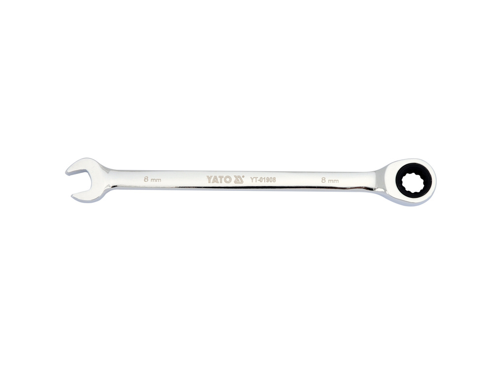 Klucz płasko-oczkowy 8 mm Yato YT-01908 to praktyczne narzędzie warsztatowe przeznaczone do profesjonalnego użytku w serwisach i warsztatach samochodowych. Jego głównym atutem jest wbudowany mechanizm grzechotkowy z 72 zębami, umożliwiający pracę już przy minimalnym kącie 5°, co znacznie ułatwia odkręcanie i dokręcanie śrub w miejscach o ograniczonym dostępie. Dzięki 12-kątnemu oczku wykonanemu w technologii AS-DRIVE klucz zapewnia lepszy chwyt oraz mniejsze ryzyko uszkodzenia łbów śrub.