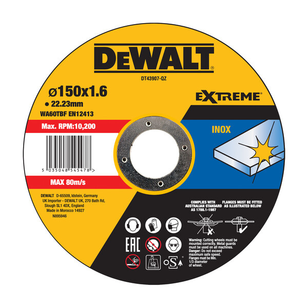 Tarcza tnąca Dewalt DT43907-QZ to osprzęt do cięcia stali nierdzewnej przy pomocy szlifierki kątowej 150 mm. Tarcza posiada grubość 1,6 oraz standardowy otwór mocujący, o średnicy 22,23 mm.