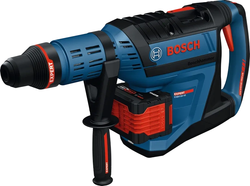 Młot udarowo-obrotowy Bosch EXPERT EXBH18V-45 zaprojektowany został do najbardziej wymagających prac budowlanych i instalacyjnych. Dzięki technologii BITURBO BRUSHLESS oraz zasilaniu z akumulatorów systemu Bosch Professional 18V, model ten oferuje wyjątkową wydajność i szybkość wiercenia, nawet w najtwardszych materiałach. Energia udaru wynosząca 12,5 J pozwala osiągnąć prędkość wiercenia do 320 mm/min przy zastosowaniu wiertła o średnicy 30 mm, co czyni go do dwóch razy szybszym w porównaniu z modelem GBH 18V-36 C.