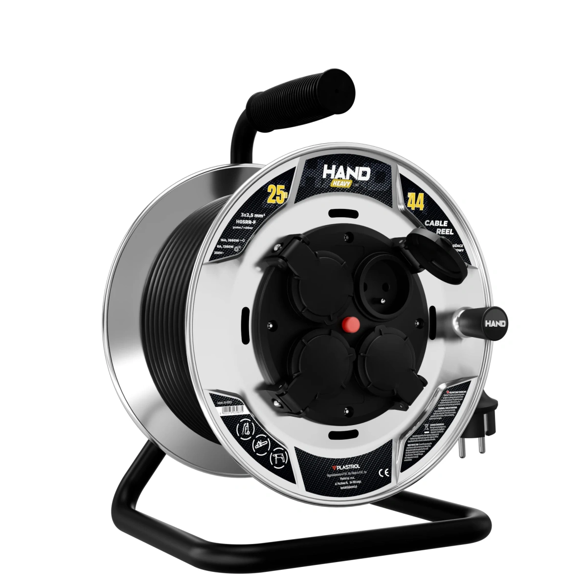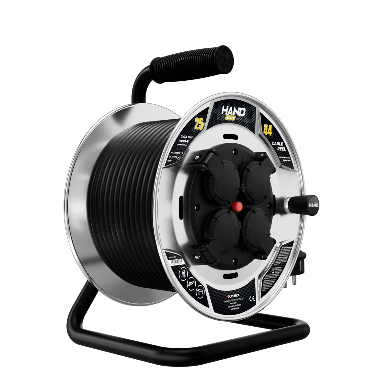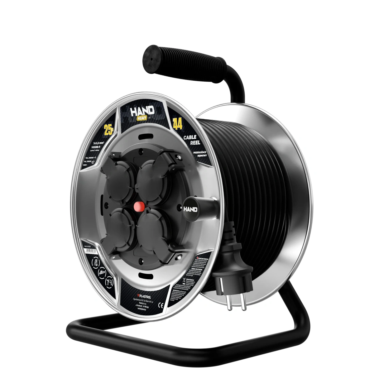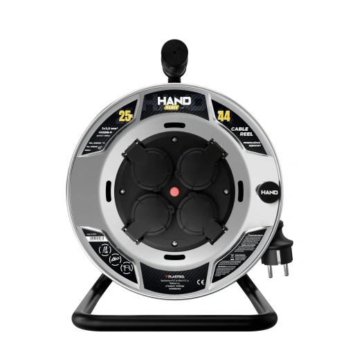 Solidna konstrukcja oraz praktyczna forma bębna umożliwiają wygodne zwijanie i przechowywanie przewodu, a maksymalny prąd obciążenia 16 A zapewnia stabilne zasilanie urządzeń elektrycznych o dużym poborze mocy. Model ten należy do serii HAND HEAVY, która charakteryzuje się podwyższoną odpornością mechaniczną i trwałością, nawet przy intensywnym użytkowaniu.