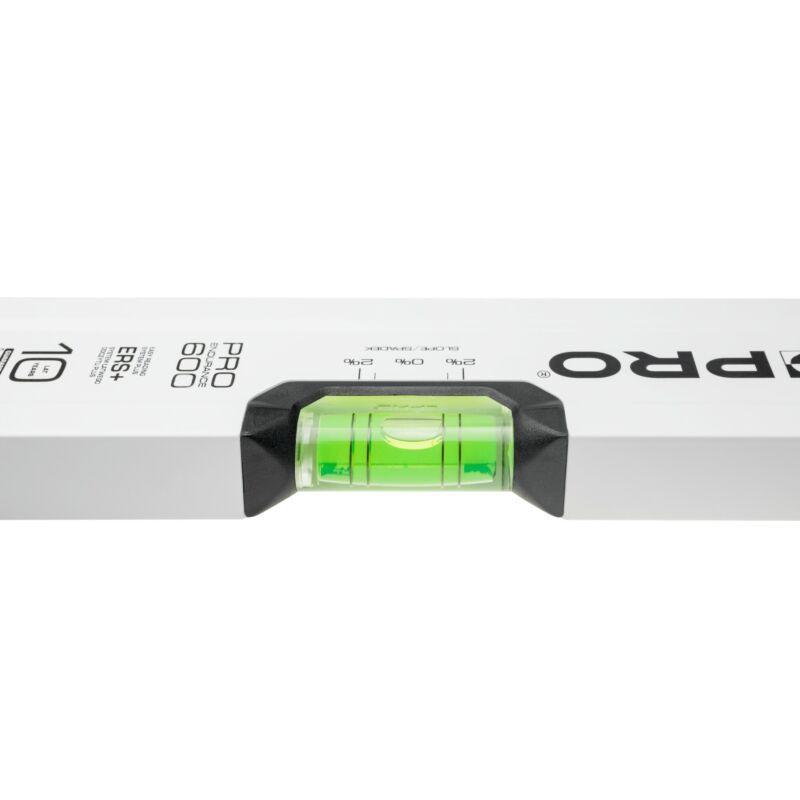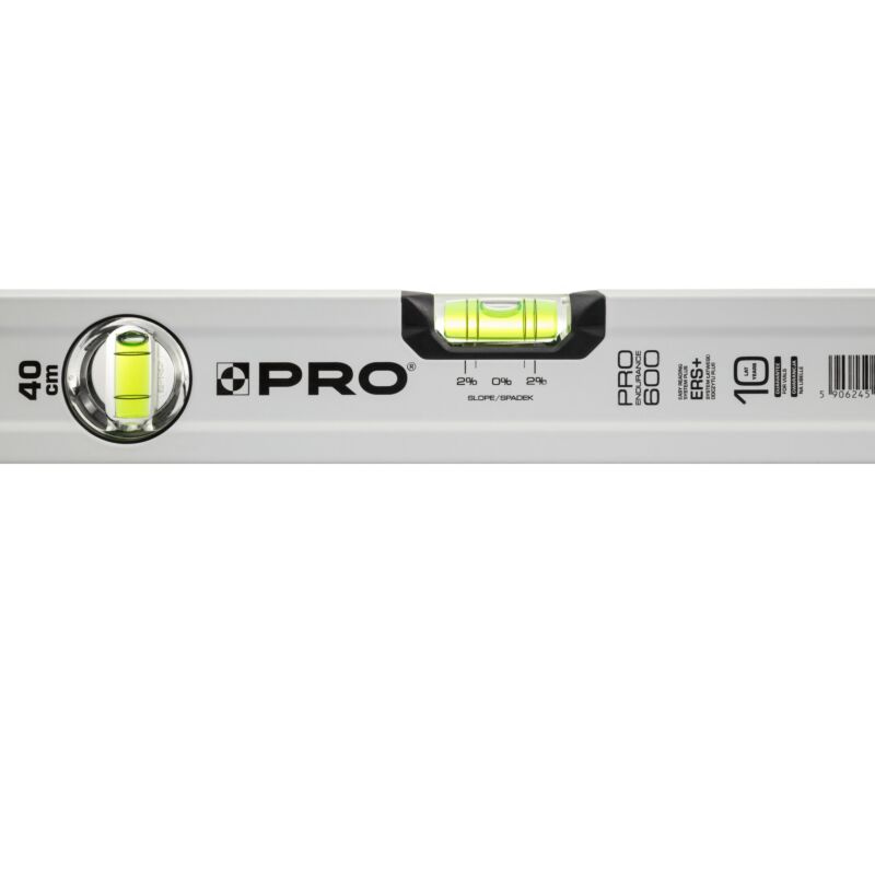 Poziomica PRO600 40 cm z libellą 2% PRO-AB040 to precyzyjne narzędzie pomiarowe zaprojektowane z myślą o profesjonalistach, którzy oczekują dokładności i wygody użytkowania. Dzięki jednokomorowemu profilowi z przetłoczeniami, poziomica łączy w sobie niską wagę i wysoką sztywność konstrukcji. Zastosowany system ERS+ (Easy Reading System) umożliwia łatwiejszy i szybszy odczyt pomiaru dzięki większemu powiększeniu soczewki. Dodatkowe pierścienie na libelli pozwalają na szybkie wyznaczanie spadku 2%, co jest szczególnie przydatne przy pracach instalacyjnych i montażowych. Białe, malowane proszkowo wykończenie zapewnia estetyczny wygląd i odporność na ścieranie. Specjalnie zaprojektowane elastomerowe nasadki końcowe (ANTI SHOCK CAP) chronią narzędzie przed uszkodzeniami w przypadku upadku, a masywne przetłoczenia boczne poprawiają ergonomię chwytu.