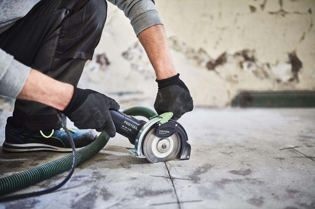 Szlifierka kątowa Festool DSC-AG 125 FH-Plus 769954 z osprzętem diamentowym to wszechstronne narzędzie o mocy 1400 W, przeznaczone do cięcia materiałów mineralnych oraz wycinania elementów w drzwiach i oknach oraz szczelinach dylatacyjnych w posadzkach, rowkach. Posiada wyspecjalizowany system odsysania pyłu, który wpływa na bezpieczeństwo i zdrowie użytkownika, zapewniając czyste i bezpieczne środowisko pracy. Dodatkowo, możliwość prowadzenia na szynie Festool pozwala na dokładniejszą obróbkę, co sprawia, że narzędzie jest idealne do zastosowań wymagających precyzji. Doskonałą widoczność podczas pracy zapewnia okienko kontrolne zainstalowane w urządzeniu.