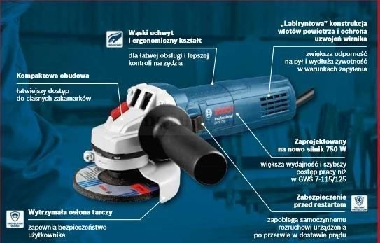 - Bosch GWS 750 0601394000 ma funkcję tzw. Anty-Restart, która zapobiega przed samoczynnym włączeniem urządzenia