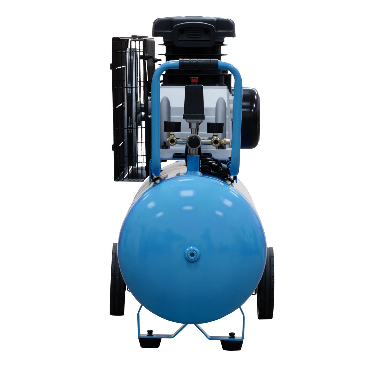 Solidny zbiornik o pojemności 90 litrów umożliwia długotrwałą pracę bez konieczności częstego doładowywania, a zasilanie 230 V pozwala na łatwe podłączenie do standardowej instalacji elektrycznej. Otwarta osłona koła pasowego umożliwia swobodny przepływ powietrza, efektywnie obniżając temperaturę pracy. Dodatkowo, koła transportowe zwiększają mobilność urządzenia, co jest szczególnie przydatne w dynamicznym środowisku warsztatowym.