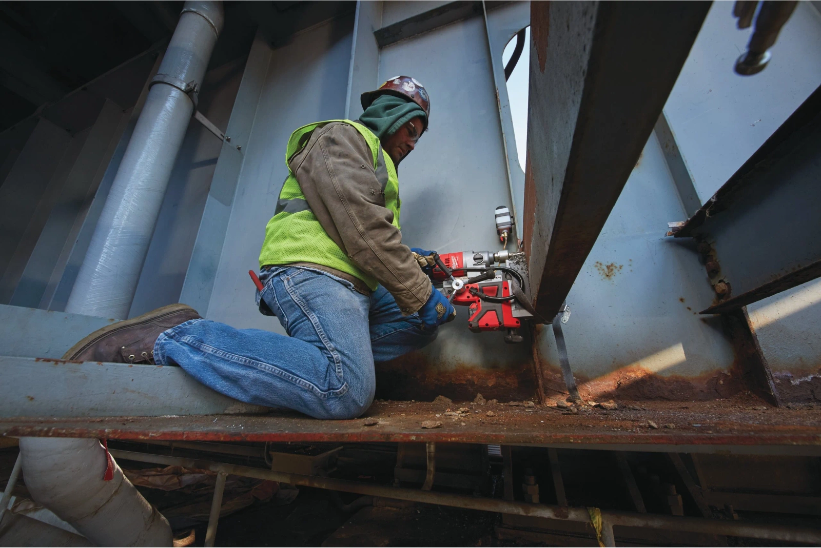 Wiertarka została wyposażona w silny magnes z własnym zasilaniem o sile przytrzymania 8890 N, co zapewnia stabilność i bezpieczeństwo pracy, nawet podczas wiercenia w pionie. System AUTOSTOP™ chroni użytkownika, automatycznie zatrzymując urządzenie w przypadku wykrycia niebezpiecznych warunków, takich jak nadmierne obroty lub przesunięcie boczne. Dwa biegi umożliwiają dopasowanie prędkości wiercenia (400 lub 690 obr./min), a beznarzędziowy uchwyt Weldon 19 mm pozwala na szybką wymianę akcesoriów.