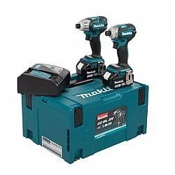 Zestaw narzędzi Makita COMBO DLX2211TJ. W zestawie: akumulatorowa wkrętarka impulsowa DTS141, akumulatorowy klucz udarowy DTD170, 2 akumulatory BL1850B (18 V/ 5,0 Ah), ładowarka DC18RC, walizka systemowa MAKPAC.