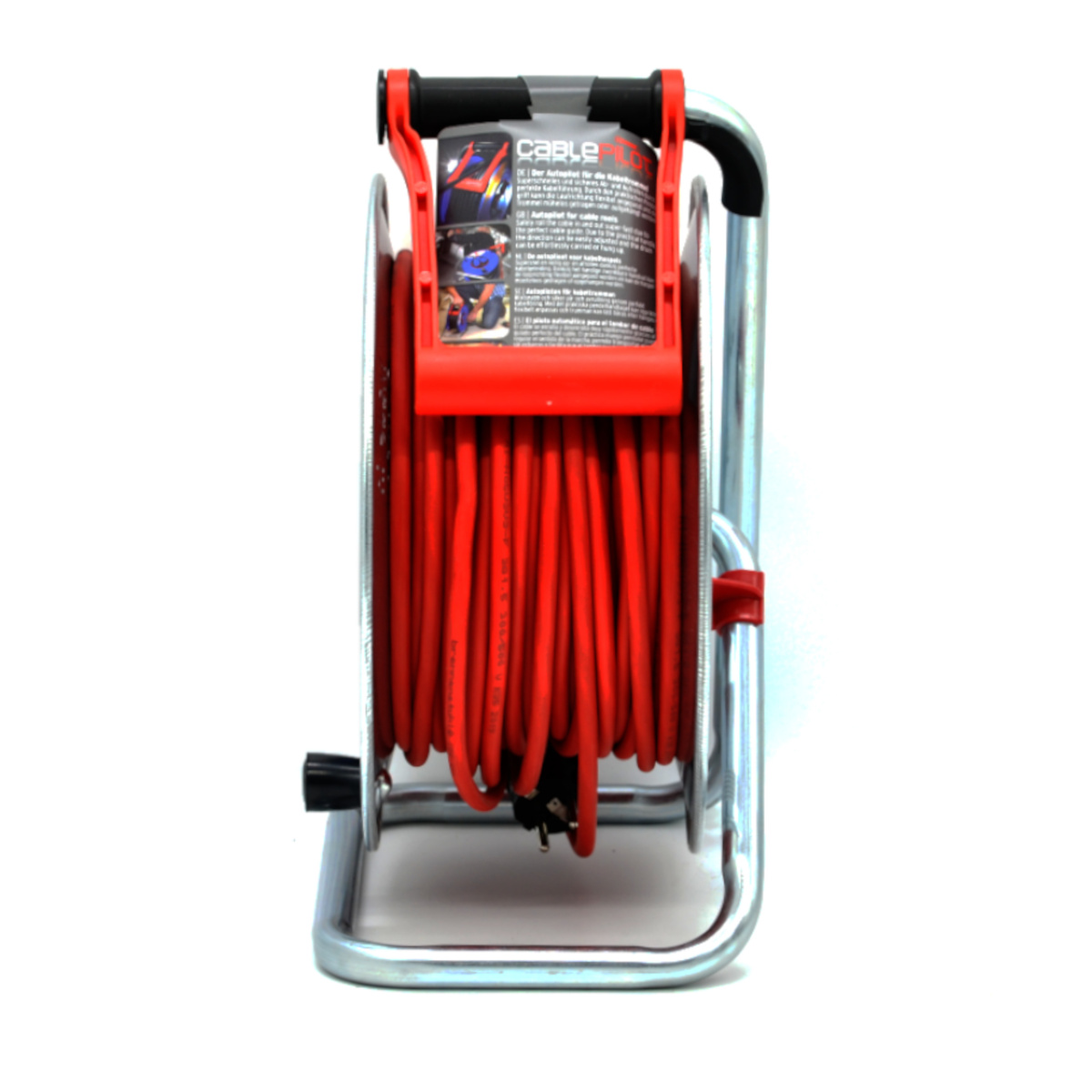 - Stabilny stelaż pozwala na swobodne ciągnięcie przewodu, a obrotowa rączka ułatwia jego zwijanie.