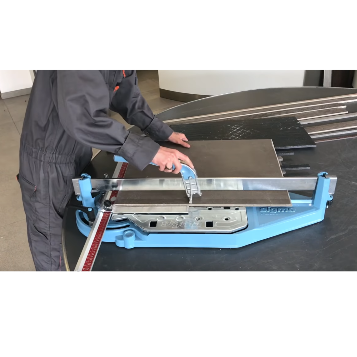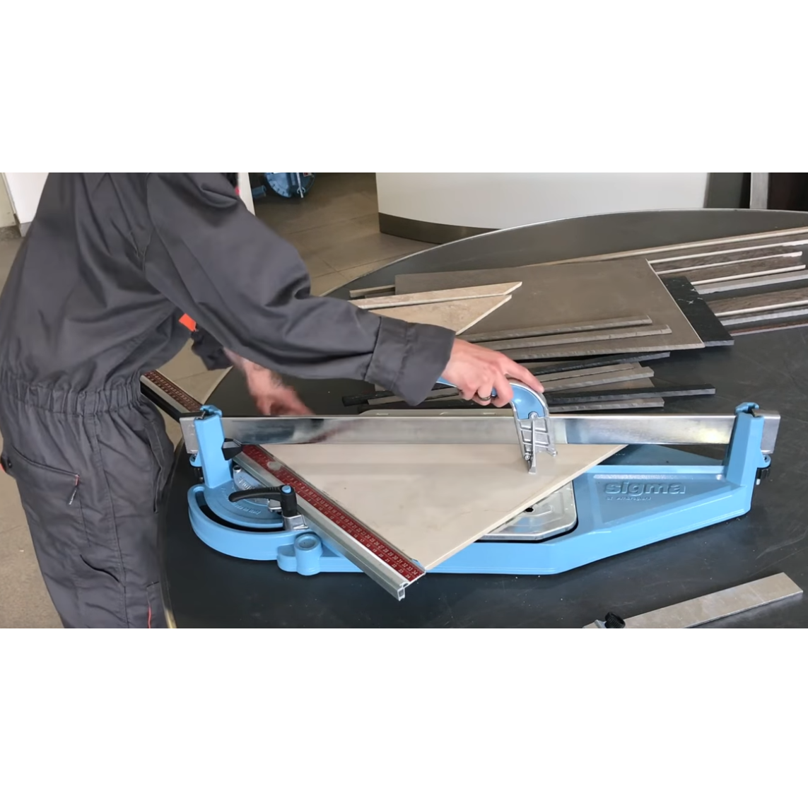 Sigma ART-3B4M to ręczna przecinarka do płytek o efektywnej długości cięcia 62,5cm. Charakteryzuje się bardzo wytrzymałą i solidną konstrukcją. Proces cięcia odbywa się zarówno poprzez pociągnięcie (do siebie) głowicy z nożem jak i poprzez popchnięcie (od siebie) głowicy z nożem. Jej głównym przeznaczeniem jest cięcie płytek. Model Sigma ART-3B4M pozwala na regulację wysokości prowadnicy, dzięki czemu możliwe jest cięcie bardzo grubych płytek. Ponadto maszynka posiada specjalny ogranicznik, który pozwala na powtarzalne cięcie. Zaletą tej przecinarki jest możliwość cięcia pod kątem w zakresie +45° do -45°. Sigma ART-3B4M posiada skalę metryczną z miarką boczną i przekątną, długą ekierkę oraz system do szybkiej wymiany uchwytu tnącego. Dodatkowo w celu transportu przecinarkę można złożyć. Na spodzie konstrukcji znajdują się gumowe stopki zapobiegające ślizganiu się urządzenia.