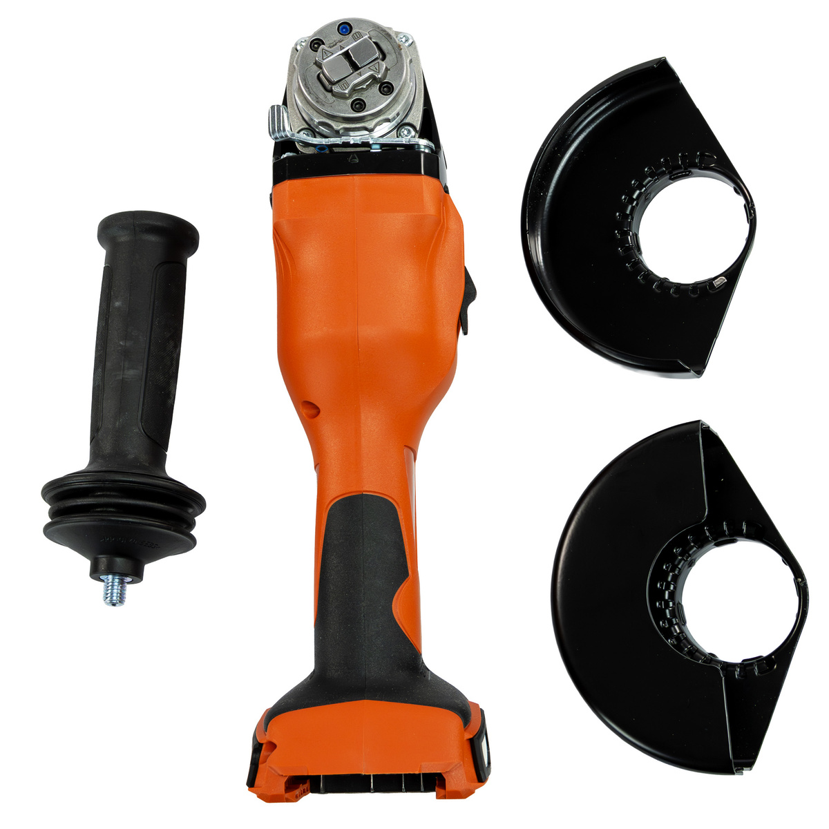 Widok kątówki z obu stron oraz dostarczanego wraz z nią akcesoriów - uchwyt boczny i dwie osłony (osłona do szlifowania i osłona do cięcia)