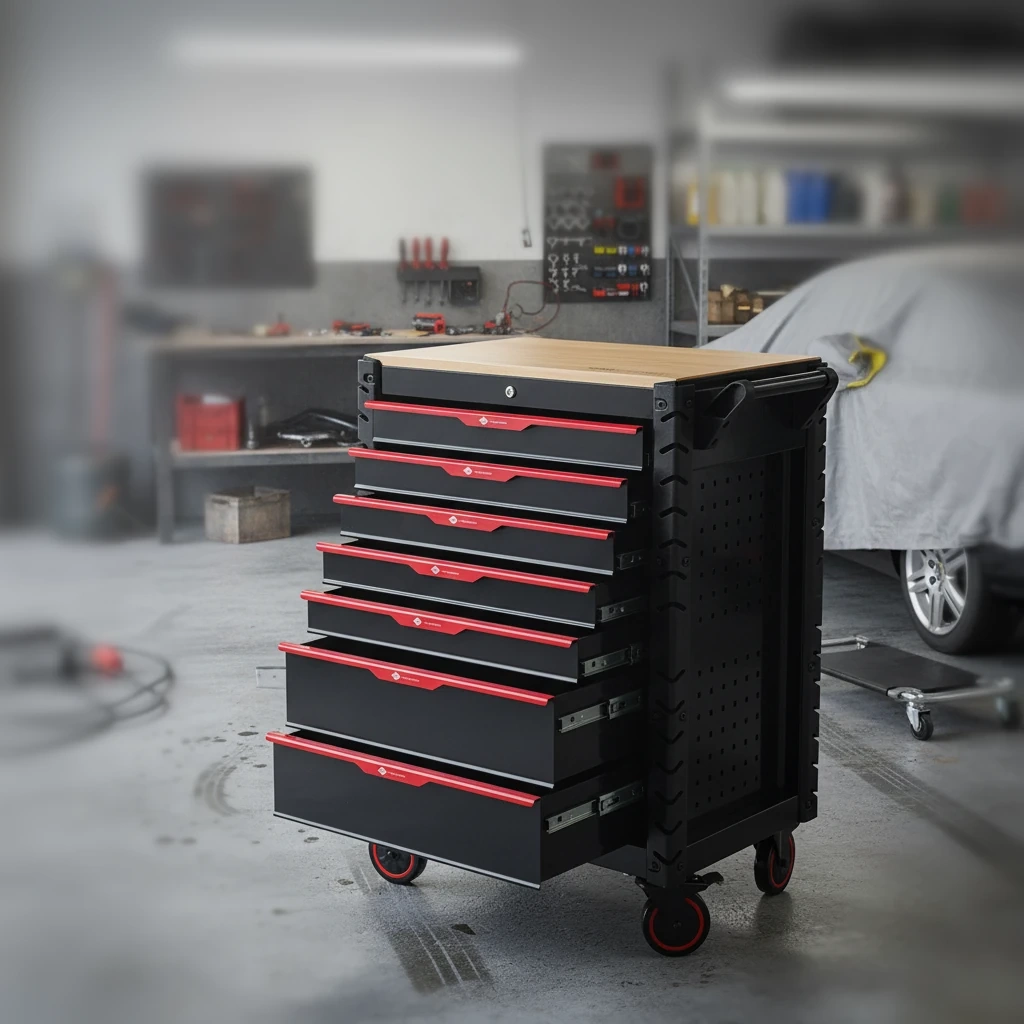 Wózek wyposażony jest w stalową, wzmocnioną konstrukcję, centralny zamek oraz 4 skrętne koła (w tym 2 z hamulcami), co zapewnia stabilność, bezpieczeństwo i wygodne przemieszczanie. Zastosowanie drewnianego blatu sprawia, że może on pełnić funkcję mobilnego stołu roboczego. To uniwersalne rozwiązanie dla profesjonalistów i entuzjastów majsterkowania, którzy potrzebują uporządkowanego i trwałego systemu przechowywania narzędzi.